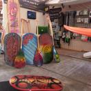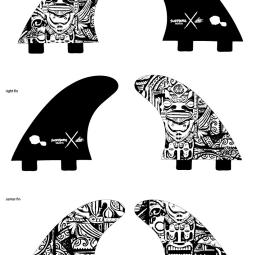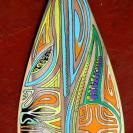 Sur un fond de tapa coloré, notre tiki de pierre se la péte grave avec ses lunettes de soleil. Voilà une bonne raison de les exposer sur votre planche favorite!