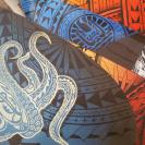 Sur un fond de tapa coloré, notre tiki de pierre se la péte grave avec ses lunettes de soleil. Voilà une bonne raison de les exposer sur votre planche favorite!