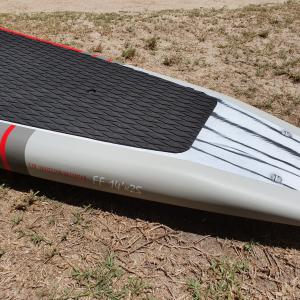 Par ailleurs, l'ensemble de cette gamme est équipée d'une étrave inversée "perce vague". Ainsi pour qu'elle puisse travailler correctement, ces paddles ont leurs rails entièrement en carbone pour une efficacité maximale. Son deck décaissé permet, tout en gardant un volume enfermé important, de rapprocher le centre de gravité du rameur au plus près de l'eau. Meilleur ton équilibre sera, plus efficace tu rameras disait maitre Yoda!
